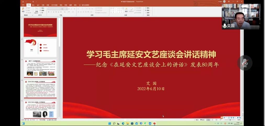 2022年6月10日上午,best365英国体育在线举办了第57期青年马克思主义者双周论坛。由于疫情原因,本次论坛采取线上形式举办,以毛泽东的《在延安文艺座谈会上的讲话》(以下简称《讲话》)为主要学习内容,邀请best365英国体育在线艾国教授进行讲解。本次论坛由张宇晗同学主持,邀请best365英国体育在线党委书记高峰教授、2021级班主任姚郁卉老师参加,2021级全体硕士研究生参加了本次论坛。